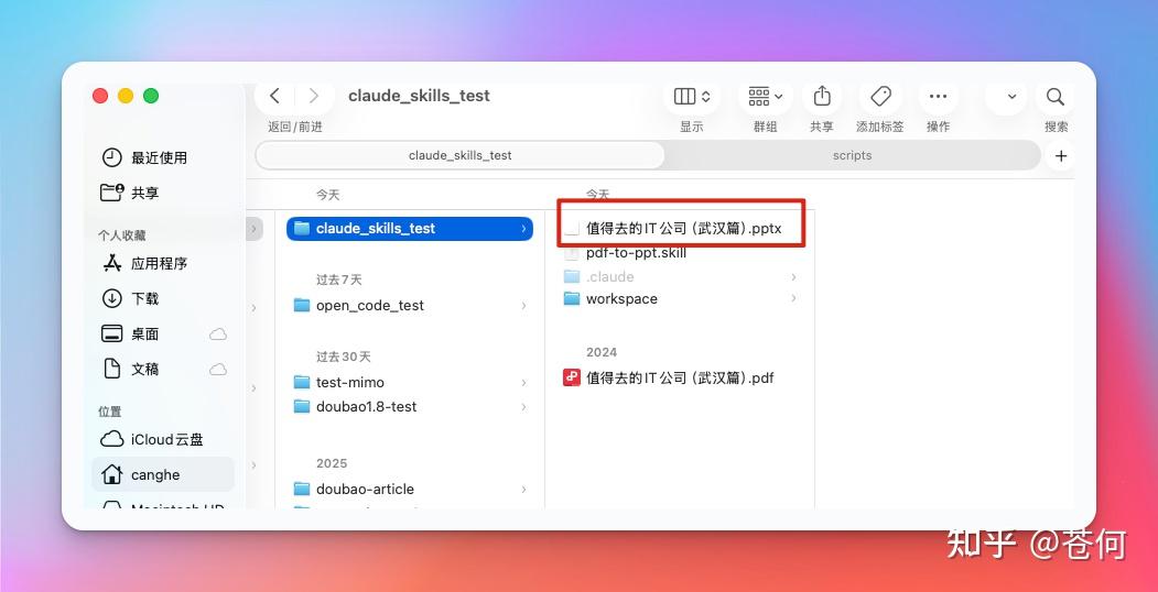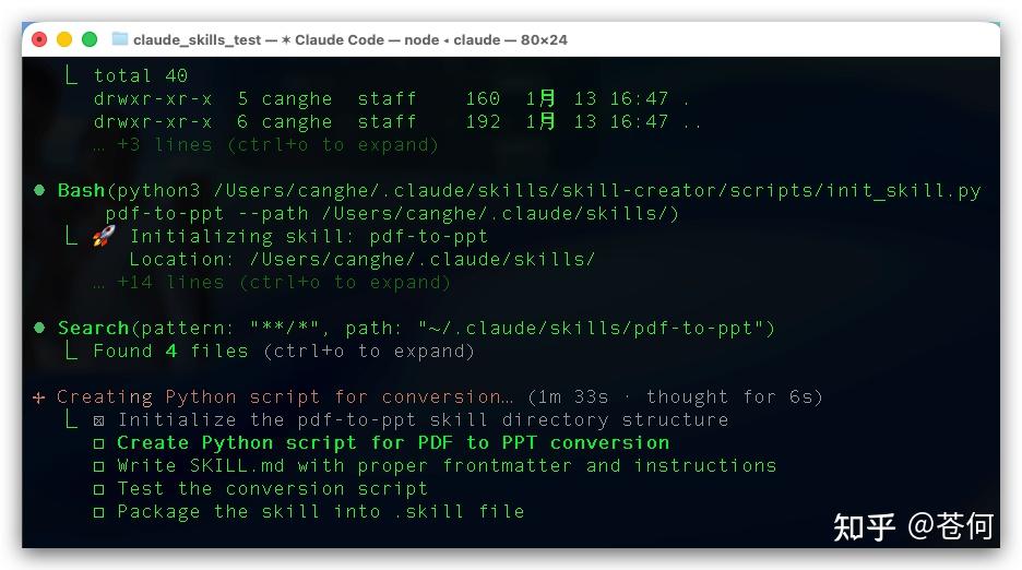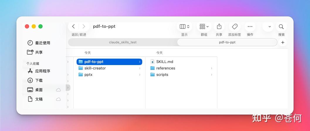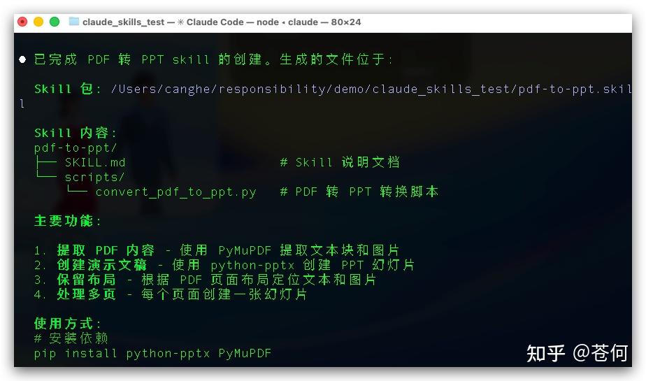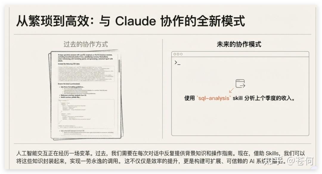 下面就可以在 CC 里面快速的创建 skill 创建一个 skill,能自动将 pdf 转为 PPT  开始一顿操作来创建这个 skill 了:  接下来就什么都不用管了,很快就生成好了这个 skill:  对应的文件夹也生成 ok 了。  来做下验证,输入以下提示词: 帮我把“值得去的IT公司(武汉篇).pdf”转为 ppt 格式  转好了:  打开项目看一下:  来看看效果,没什么问题:  做一个 skill 几分钟时间,非常方便。 写在最后Skills 改变了我们与 AI 协作的基本方式。它们将一次性的提示,转变为持久、可组合的知识资产。 通过为 AI 建立一个可扩展的程序性记忆库,Skills 正在为下一代代更强大、更自主、更能与人类专家无缝协作的 AI Agent 奠定基础。 Skills 把各种经验和方法打包成技能包,降低了跨行使用的成本,普通人也更加方便的创作自己的 Agent 了。 我觉得,掌握 Skills,就是掌握了将组织智慧规模化的能力。 未来,Skills 还会一如火爆,会有越来越多的 Skills 出来。 好了,今天的文章就到这里了,谢谢你喜欢我的文章,我们下期见。 同时,大家如果对 Skills 感兴趣,可以后台回复:Skills,一起加入交流群,探讨。