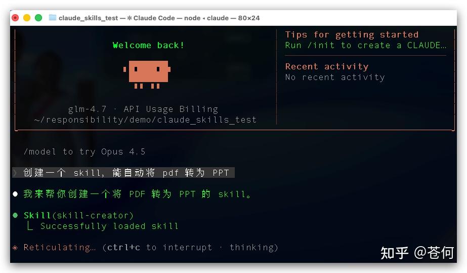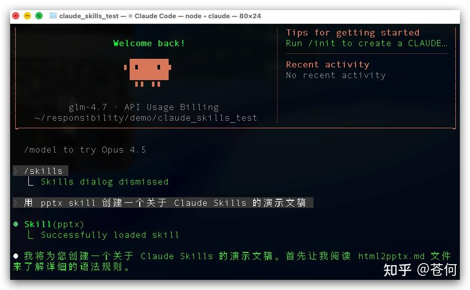 然后选择一个文件夹,终端输入: claude,即可启动。  但是要想使用还是需要配置一下 API 的,有挺多种办法,你可以选择官方的 Claude,非常贵,你也可以选择中转的 API,性价比高,当然你甚至可以选择 GLM 4.7,相对划算。 通常我还会安装一个工具叫 CC Swtich,用来管理各种 API 的配置。  第二步,在 Claude Code 中安装 Skills 一共有三种安装方式,分别是: 方式一:自然语言安装 你可以直接让 CC 来安装,直接提需求: 帮我安装下 skill,项目地址是:https://github.com/anthropics/skills/blob/main/skills/pptx