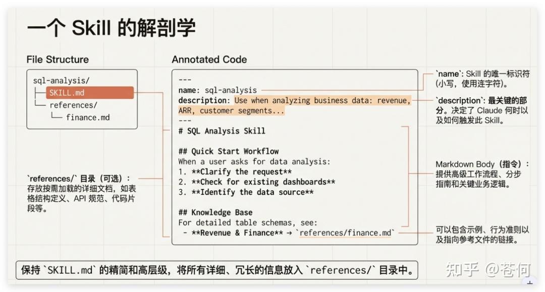 3、SKILL. md:核心指令、触发条件、执行指引等。  其中 SKILL. md 内部剖析如下: