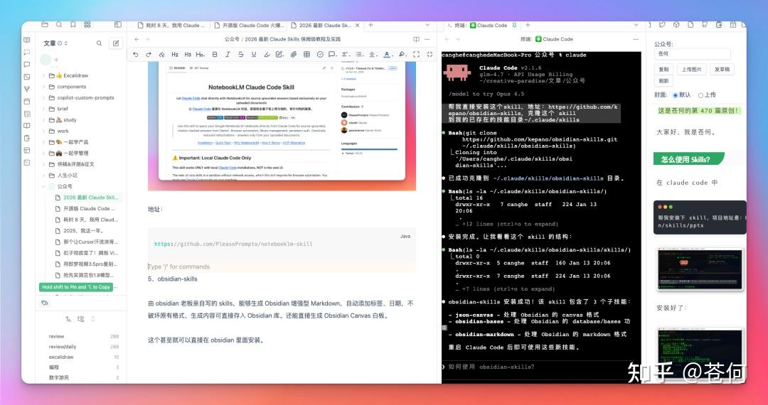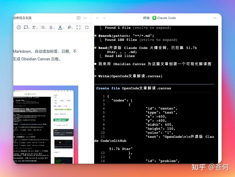 5、obsidian-skills 由 obsidian 老板亲自写的 skills,能够生成 Obsidian 增强型 Markdown,自动添加标签、日期,不破坏原有格式,生成内容可直接存入 Obsidian 库。还能直接生成 Obsidian Canvas 白板。 这个甚至就可以直接在 obsidian 里面安装。  然后输入提示词: 用obsidian-skills画一个 canvas 来解读这一篇文章"开源版 Claude Code 火爆全网,已狂飙 51.7k Star。。。"
