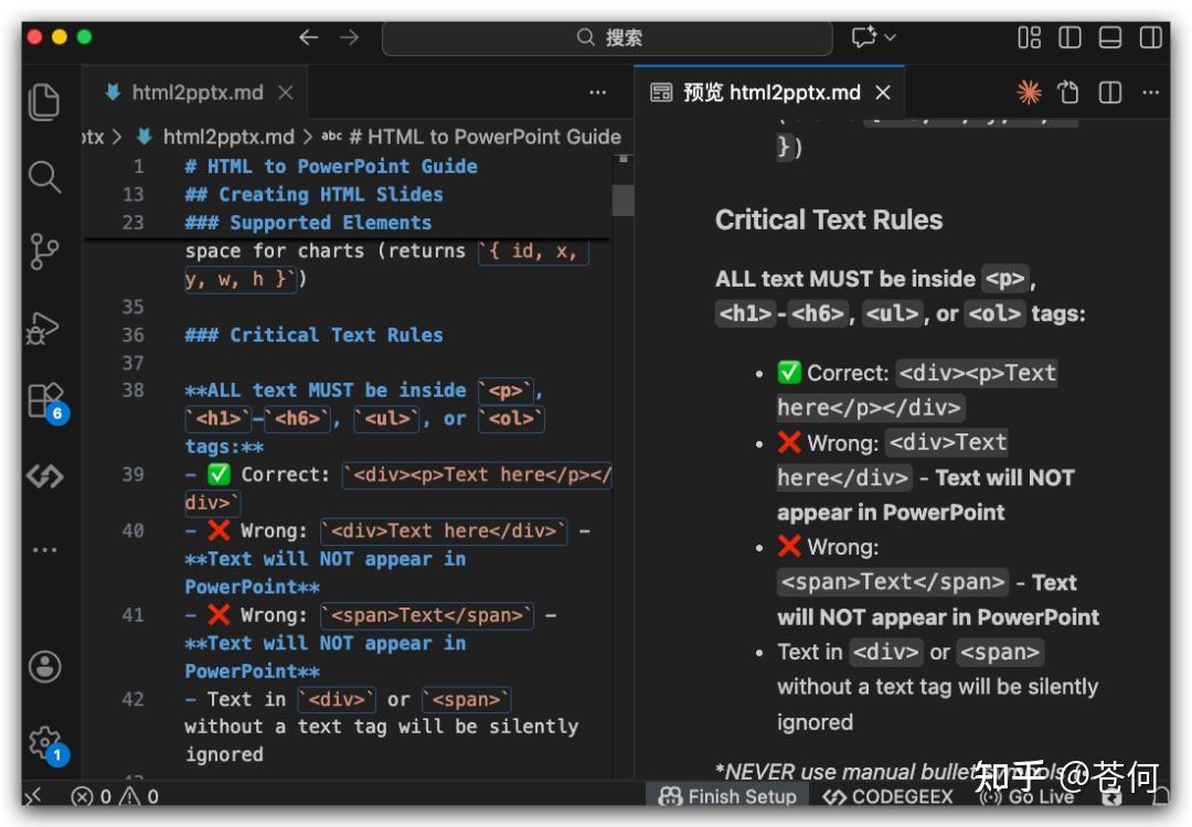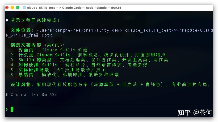 当安装好 skills 后,需要重启一下 Claude Code。 要想使用的话,可以直接指定 skill,也可以按照用户意图,Agent 自动选择合适的 skill。 比如输入 prompt: 用 pptx skill 创建一个关于 Claude Skills 的演示文稿  可以看到先是去用 HTML 来写 PPT,然后调用 pptx skill 里面的 html2pptx.md 约束,把 html 转为 PPT。  而这个约束文件 html2pptx.md 是对 html 转 PPT 的一些约束规则和条件,通过 markdown 的形式约束了。  Claude Skills 经过一番苦战,终于完成了。  我们来看下效果: