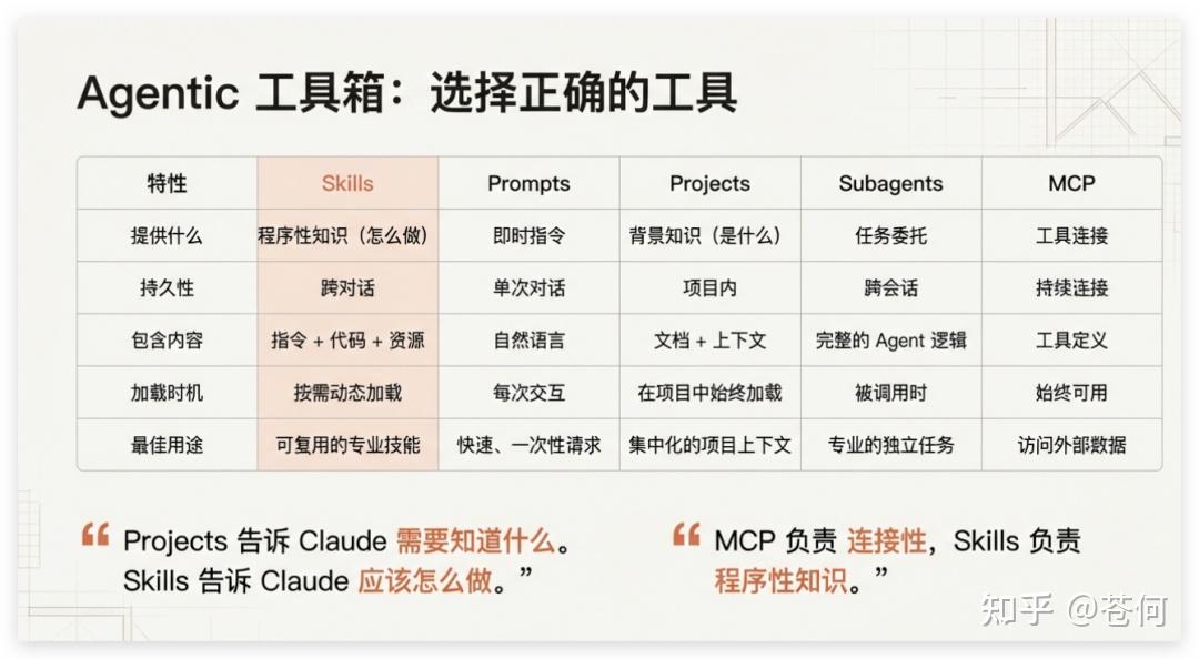 Skill能否被准确触发,完全取决于其SKILL. md 中 description 的质量。它非简单的关键词匹配,而是 Claude 对其能力和适用场景的语义理解。 Skills 是构建强大 Al Agent 的核心基石,但它并非孤立存在。为了发挥最大潜能,我们需要理解它如何与 Anthropic生态系统中的其他组件协同工作。 和 MCP 区别及联系最大的困惑其实是和 MCP 区别。我做了个图:  MCP 是一种标准协议,像是大模型的手和脚,负责连接工具,而 Skills 负责程序化知识,他让 Agent 具备工作流的能力,稳定执行特定任务。 比如一份调研报告 skill,他需要通过 MCP 去连接 Google Drive 搜索最新周报,并从 GitHub 拉取竞品开源库的数据,skill 提供分析框架,指导 AI 如何进行 SWOT 分析,最后由 subagent 来执行。 怎么使用 Skills?那具体怎么使用 Skills 呢?其实在很多 AI IDE 中都可以使用了,比如 Claude Code、OpenCode。 这里以 Claude Code 为例,使用只需要以下几步。 第一步,安装 Claude Code 推荐使用 native 的方式安装,相比较于 npm 更加的稳定以及能及时更新,终端中输入: curl -fsSL https://claude.ai/install.sh | bash