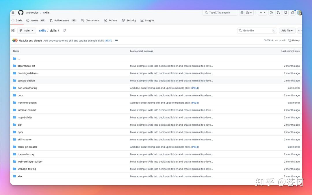 靠,非常不错啊。一个做 PPT 的 skill 就这样安装好了。 都有哪些好用的 Skills?Anthropic 官方的 skill 仓库提供了不少有用的 skill,开源地址如下: https://github.com/anthropics/skills