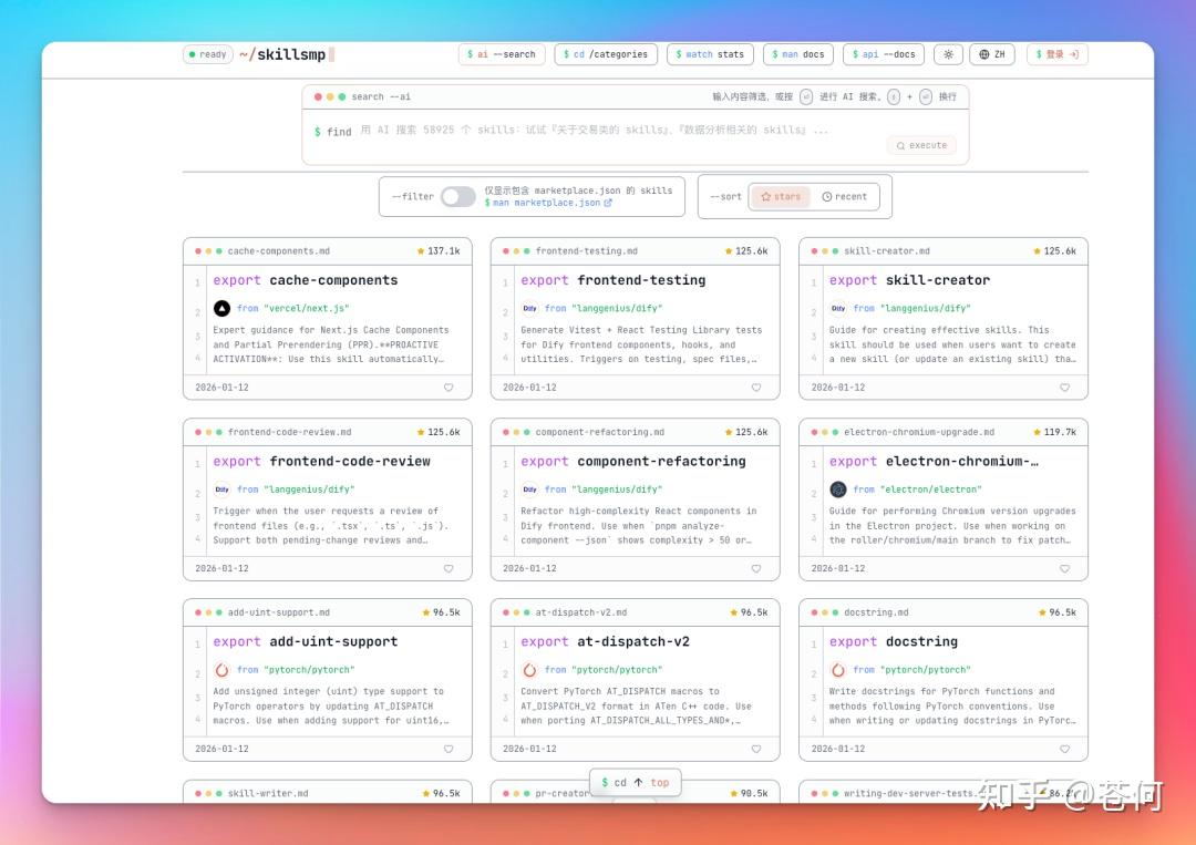 目前已经有 58925 个 Skills 了:  然后可以在这里用 AI 来搜索你想要的 Skills,也可以按照分类查找。  那都有哪些必装的 skill 呢?给大家推荐几款: 1、skill-creator Anthropic 官方出品,能够自动写 skill 的 skill。  地址: https://github.com/anthropics/skills/tree/main/skills/skill-creator