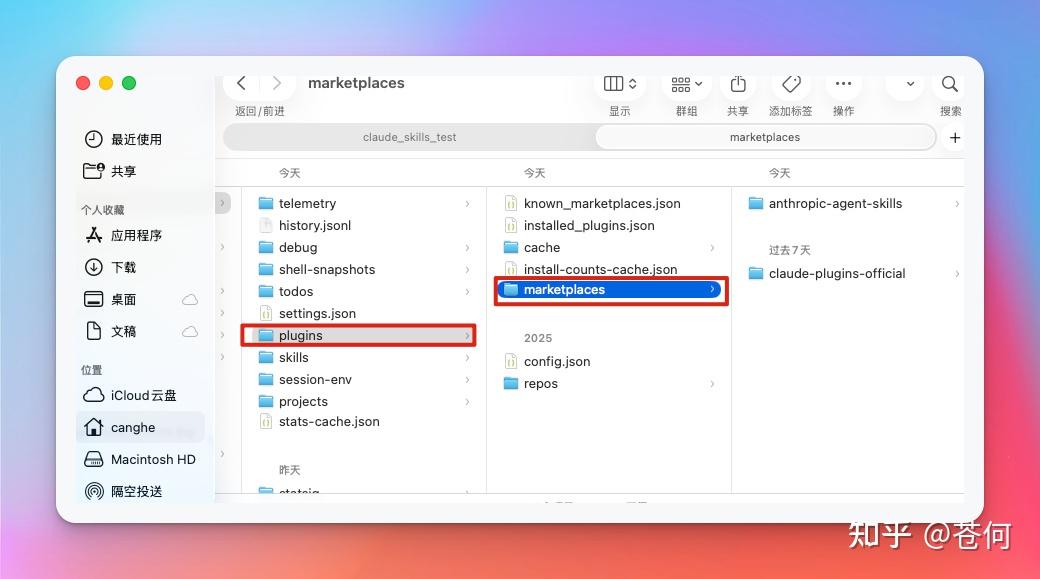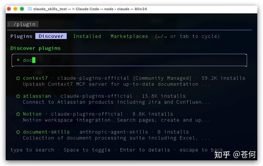 然后,在插件市场中搜索相关插件:  通过插件安装的 skills 需要在 .claude/plugins/marketplaces/ 这个目录下查看:  或者也可以直接输入命令安装插件: /plugin install document-skills@anthropic-agent-skills