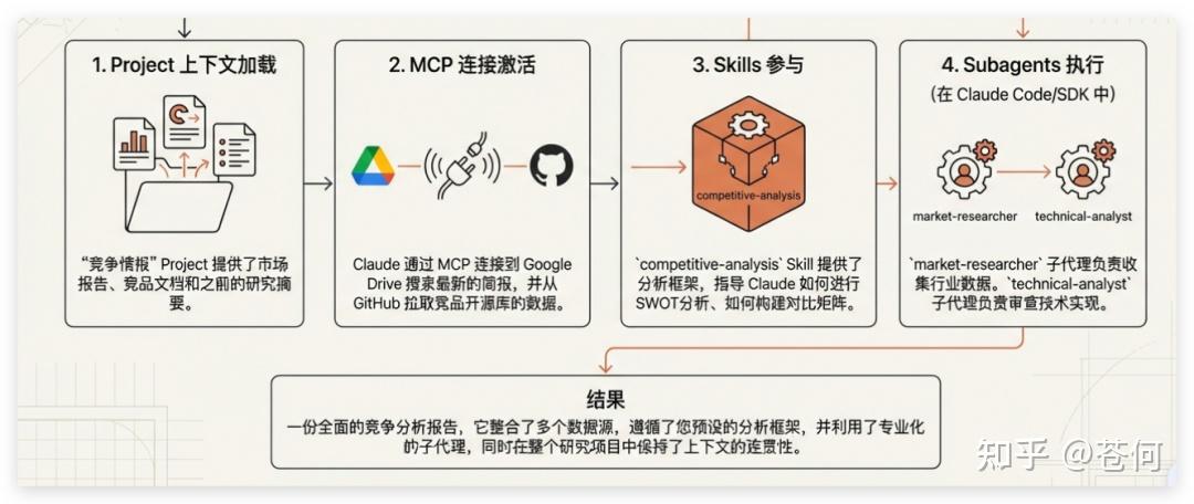 比如一份调研报告 skill,他需要通过 MCP 去连接 Google Drive 搜索最新周报,并从 GitHub 拉取竞品开源库的数据,skill 提供分析框架,指导 AI 如何进行 SWOT 分析,最后由 subagent 来执行。